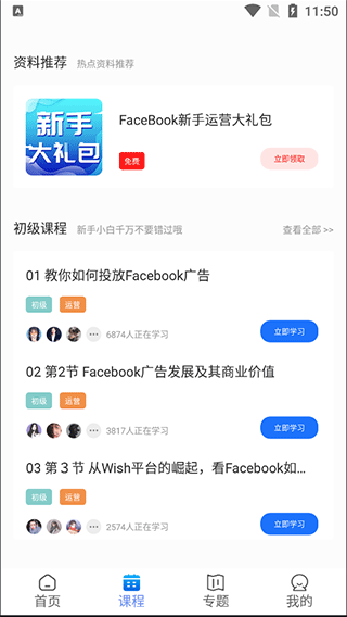 3、在“课程”页面,新用户还能免费领取新手运营大礼包,还有丰富的营销视频教程,从初级课程到高级课程,让你从一个小白变成一个基础扎实的高手;