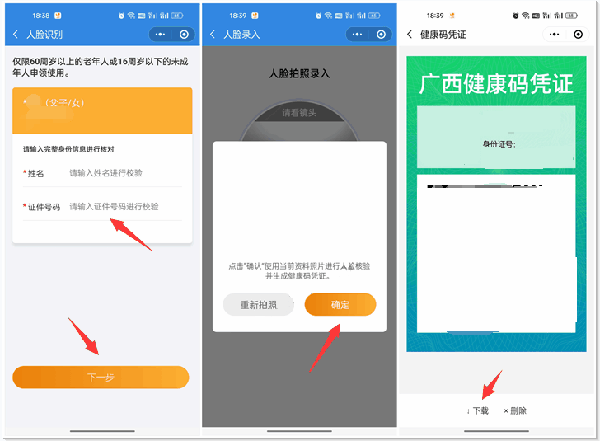 2、输入孩子或老人的姓名及身份证号码后点击【下一步】-进行人脸拍照录入,建议以白色背景为好,因为拍摄的头像是需要打印出来的,所以建议拍好一点,不行就重新拍照,满意的话就点击【确定】按钮即可成功申领广西健康码凭证。