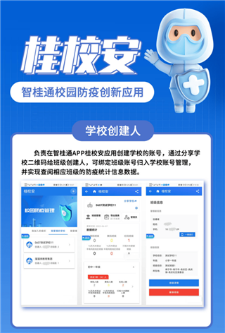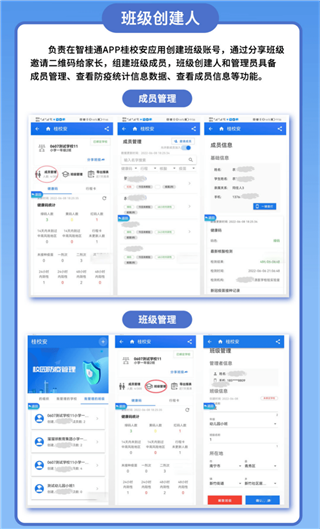 2、通过“桂校安”应用,班级管理教师可创建班级组织,通过分享班级二维码,邀请学生家长加入班级组织,学生家长可授权将个人的健康码状态、核酸检测结果、疫苗接种、行程卡等信息上传至“桂校安”。