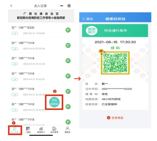 各类场所工作人员进入出入记录中的【核验健康码】按钮 >> 唤起扫码摄像头 >> 扫码识别群众展示的广西健康码凭证 >> 核验是否符合通行条件。