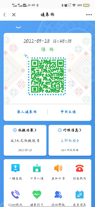 2、登录完成后,大家可以在首页找到健康码,查看自己的健康码检测时间。