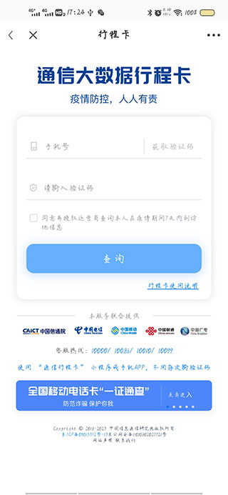3、点击行程卡,然后输入自己的手机号码和验证码,即可在线查询自己的行程。
