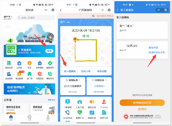一、如何申领健康码凭证?1、打开“智桂通”- 点击首页广西健康码的【亮码】按钮-点击“家人健康码”,如果还没有家人信息就点击【新增健康码代领】按钮完成家人信息添加,这里已经添加好孩子的信息,则直接点击相应孩子对应的“健康码凭证申领”。