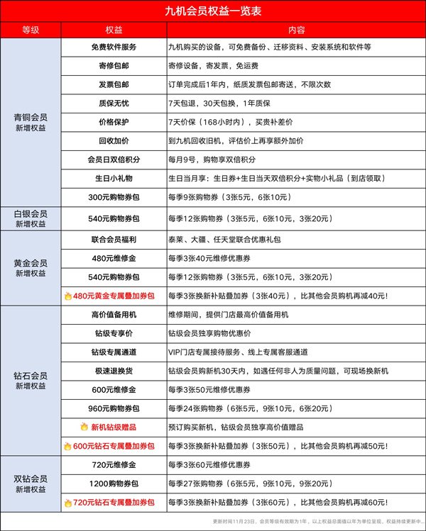 会员等级分为普通会员、青铜会员、白银会员、黄金会员、钻石会员、双钻会员。各等级会员权益如下表所示: