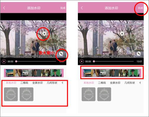 3、选择视频后用户可对视频进行水印编辑,选择视频长度,点击添加水印(放大或缩小),点击完成即可添加。