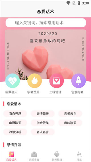 1、打开恋爱话术宝典app,首页如下图所示,包括恋爱话术、感情升温、建立情感等专栏;