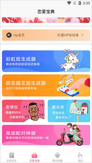 3、切换到恋爱宝典专栏中,这里包括了彩虹屁生成器、朋友圈文案生成器、表情包、藏头诗、星座配对;