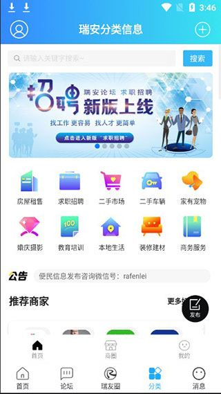 瑞安论坛app是专为瑞安人民所提供的一款健康良好的网上交流平台,集服务、娱乐、资讯为一体,能够让用户随时随地享受便民服务功能,一键即可获取本地最新资讯,享受社交沟通的快感。不管你是找工作、租房、进行娱乐活动,该软件不仅能通通帮你快速解决,还能将瑞安人民的感情连接起来,内容丰富,功能强大,另外,且有便于瑞安市民沟通的瑞友圈,无需出门,在家即可轻松了解本土信息,发布所见所想,与好友随时沟通,欢迎各位前来对瑞安生活信息以及延伸瑞安新闻的讨论 。功能介绍