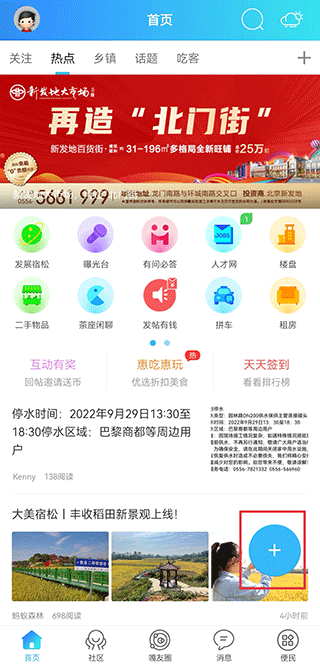 1、打开宿松论坛手机版,在首页中点击右下角蓝色+号
