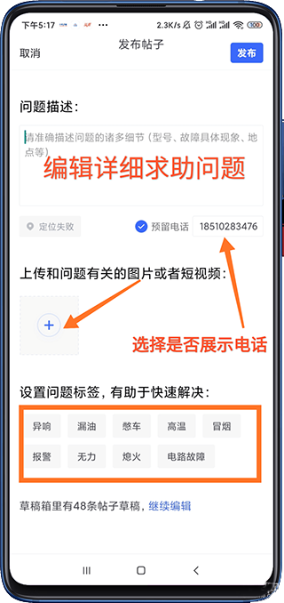 求助帖:简化发帖流程无需标题,只需在问题描述栏将遇到的故障问题、具体机型等详细描述清晰,然后配上图片和视频,才会获得更多甲友的回复,另外还可以选择展示自己的手机号,方便甲友电话为你解决问题,下方可选择常见的故障问题标签,有助于快速解决问题。