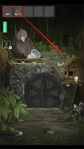 15、将唱片机放到石桌上面,插上摇杆,启动唱片机;