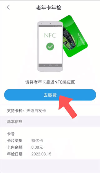 10、点击左上角返回至“老年卡年检”界面,将老年卡再次靠近手机背部的NFC区域,提示“年检成功”,老年卡年检完成。