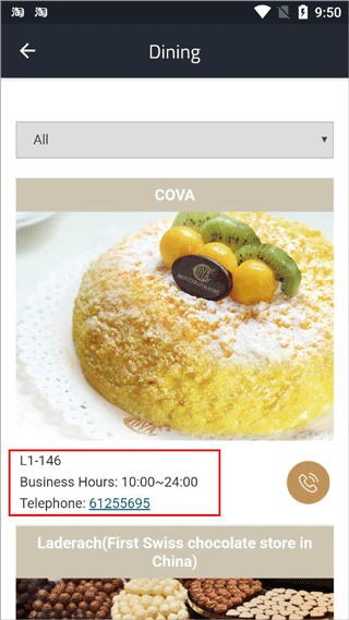 4、点击Dining,可以查看大厦内所有的餐厅及其营业时间、电话等;