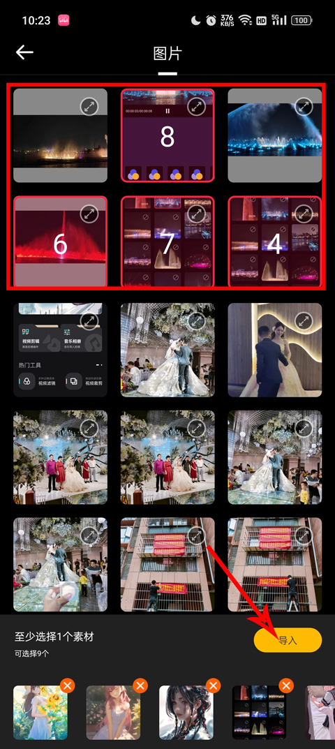 2、首先进入到视频剪辑,在相册中导入一个素材,选择后进入导入;