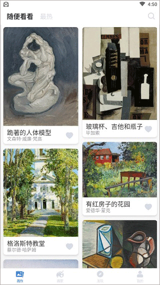 世界名画集app是一款专为艺术而生的绘画者“集中地”,在这里你不仅能欣赏来自世界范围内的名画大师作品,还能阅读100多位画家的人物生平,从作者的生活背景,体会来自艺术的创作灵感。如果在浏览期间有任何比较感兴趣或者喜欢的画作都能一键保存,海量高清大图的匠心细节,只为给爱好艺术的你插上翅膀,足不出户,纵览世界级名画,找到属于自己的世界,找到属于自己的那一片天空。目前,世界名画集软件的整体界面设计比较的简洁,在菜单栏的导航中共有四项功能,依次有画作、画家、发现和我的,其中在画作栏中,有随便看看和最热分类,期间你还可以通过右侧的搜索功能来定位你感兴趣的作。另外在欣赏绘画作品的时候,只要发现自己感兴趣的作品都可以直接收藏,以后就能随时在这里查看绘画作品,让您能够自由的欣赏绘画内容。至于画家,上文中小编已作简单描述,而关于发现,则类似一种社区功能,在这里你将与相同爱好的绘画者一起交流经验,分享心得,针对以上所述,如果对艺术画作比较感兴趣的用户,不妨在此欣赏一下大师手笔,或许你能从中汲取到更多创作灵感哦~