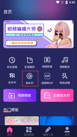 2、添加水印、无痕去水印、添加字幕、文字编辑、贴纸