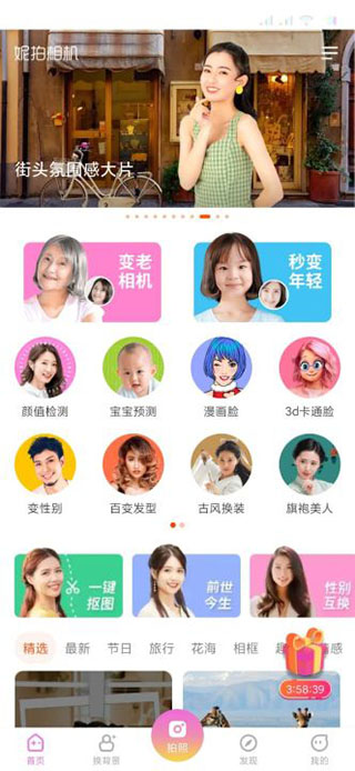 妮拍相机app是一款深受广大用户喜爱的相机软件,该软件能够为你带来更加多样的趣味拍照的体验与玩法,拥有非常多的滤镜特效等拍照的效果,轻松的打造无敌美颜自拍。用户可以在该软件中可以获得时下最热门的贴纸与滤镜,添加了丰富的面部转换以及边框背景的变换效果,超过百个免费的滤镜以及美颜效果可以自由使用,同时还包含时下所有火热的拍摄功能,能够让用户轻松拍摄出网红大片。除此之外,全新的妮拍相机还拥有颜值检测、宝宝预测、漫画脸、3d卡通脸、百变发型、古风换装、旗袍美人等特色功能,可以让你拍摄出多种不同风格的照片。同时软件还有强大的AI多人抠图功能,可以让你和远在天边的朋友轻松同框,感兴趣的朋友可以来下载体验一下。