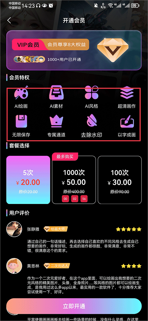 除此之外,AI画师app中还有大量的其他用户绘制的AI绘画,用户都可以随意浏览和下载,而且开通会员更是能享有会员的专属特权,例如无限保存、专属通道、去除水印、超清画作等等。总之在这里,你将成为自己的画师,挥洒自己的灵感,尽情释放你的灵感,海阔凭鱼跃,天高任鸟飞!感兴趣的话不妨来下载体验一下吧!