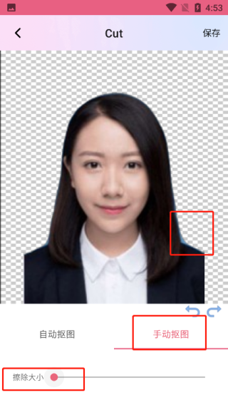 4、一键抠图后可以点击手动抠图,调节擦除的大小,对没抠好地方进行调整;