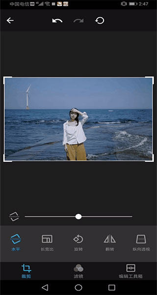 进入【裁剪】菜单后,可以看到水平、长宽比、旋转、翻转、纵向透视、横向纵视、拉伸等7种模式。