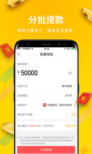 1、审批快:当天审核、当天放款、通过率高2、额度高:1-50万额度、分批提款、借钱不求人