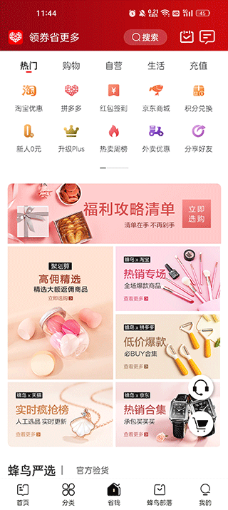 3、点击省钱,在这个页面有许多特价商品以及新人零元福利;