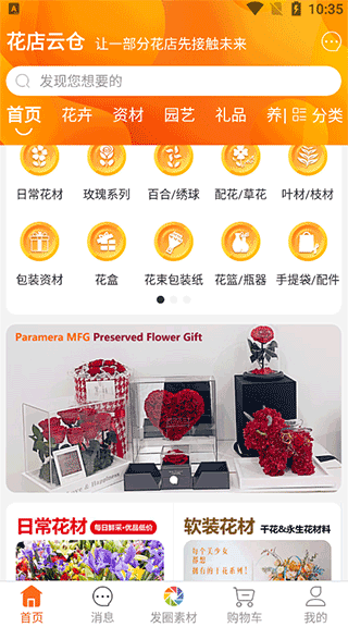 1、打开花店云仓手机版,首页便可以看到花朵的售卖状态了,这里面包括花朵的材料、礼盒的品质等;