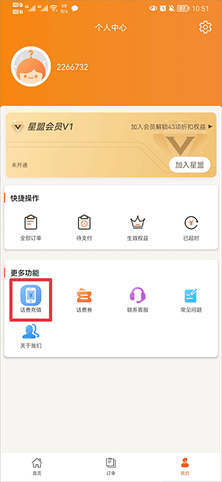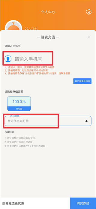 3、最后在上方输入手机号后,并在下方选择可用的优惠券,并进行充值即可