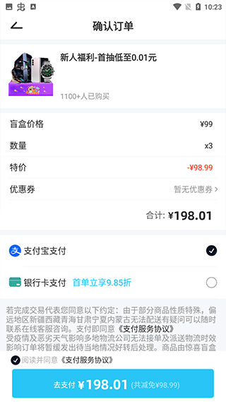 3、进入盲盒页面后,选择购买方式,点击支付;