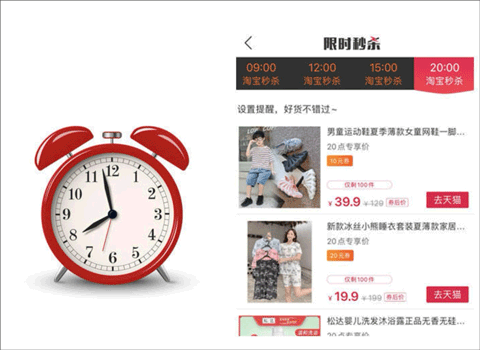 1、在限时秒杀页面中会呈现各个时间段的秒杀活动,当到达该时间段后找到需要购买的商品,并点击去淘宝