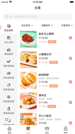 3、在分类这里,拥有新品尝鲜、精选推荐、海味食验室、肉肉食验室、坚果食验室、烘焙食验室等等;