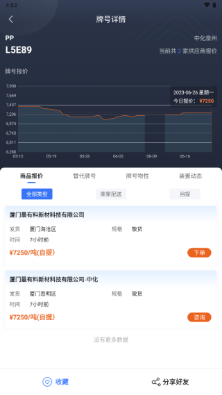 5、进入牌号详情界面,可看到详细的商品报价、替代牌号、牌号物性和装置动态以及发货类型等信息,