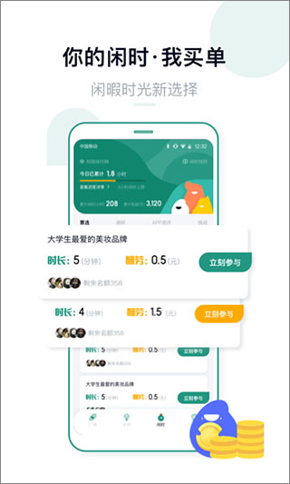 【闲时】满足大学生足不出户线上就可以勤工俭学需求,精心筛选知名品牌,发布票选、调研、30秒问答、话题测评等多样化即时有奖短任务,大学生利用闲暇时间动动手指即可完成任务,轻松赚钱同时也多一扇了解社会企业的窗口!