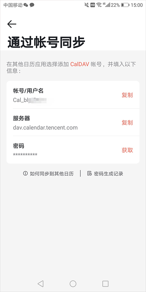 接着我们就可以看到账号信息了,用户在其它日历应用中就可以将这些信息复制过去即可