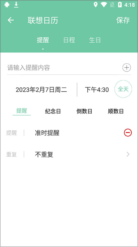 2、点击下方的加号,可以进行设置时间进行提醒、日程和生日,让你不会忘记重要的日子。