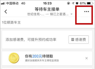 2、进入行程后可以查看当前顺路的司机,如果没有合适的可以取消行程或者重新发布。我们点击右上角三点图标按钮;
