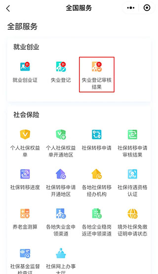 访问“全国服务”—“更多”—“失业登记审核结果”,可查询之前提交申请的审核结果,进而享受为失业人员提供的相关服务。