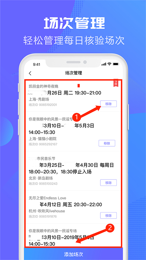 1、进入【场次管理】界面,可根据不同时间安排的场次进行添加或移除专场验票,轻松管理每天的核验场次,