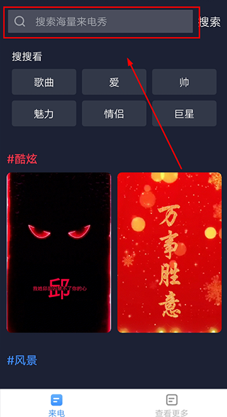 1、打开完美来电秀app,点击【搜索】,查找喜欢的类型来电秀;