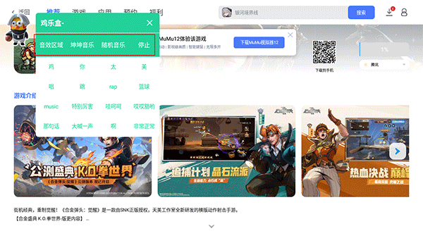 坤坤音乐区,长按即可下载保存歌曲,保存的歌曲在鸡乐盒文件夹,点击右上角的停字即可停止音乐播放。