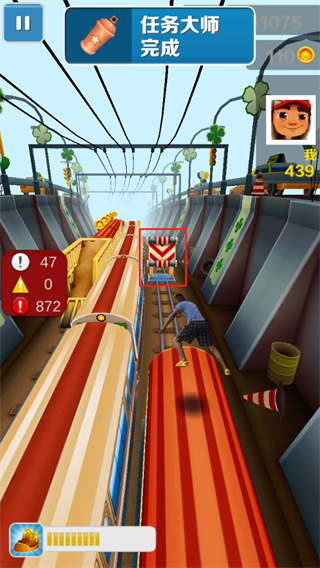 游戏玩法很简单,就是左右划动屏幕躲避障碍物,还能在屏幕上点击道具使用。虽然操作简单,但因为画面和音乐都很欢乐,反而挺有挑战性的。我刚开始玩的时候经常被抓住,后来慢慢熟悉了节奏才开始能跑得更远。