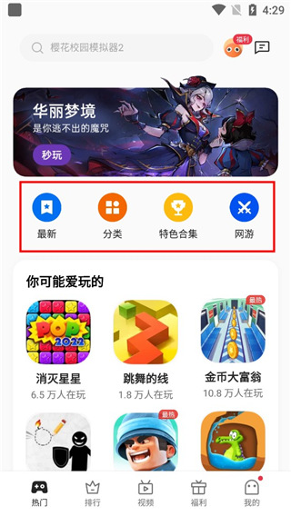 1、首页是热门游戏,有四个板块功能,最新、分类、特色合集和网游;