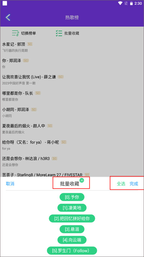 3、选择你想要收藏的歌曲,然后点击右边的完成按钮。
