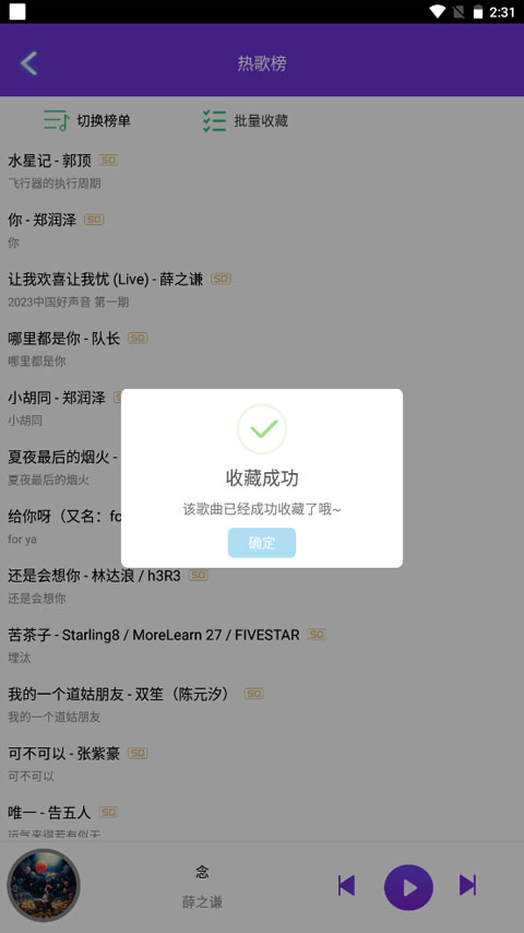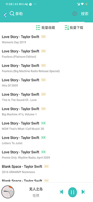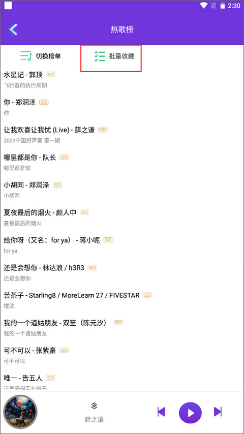 2、这时歌曲列表中就会有很多的音频等你收藏,点击右上角的“批量收藏”功能。
