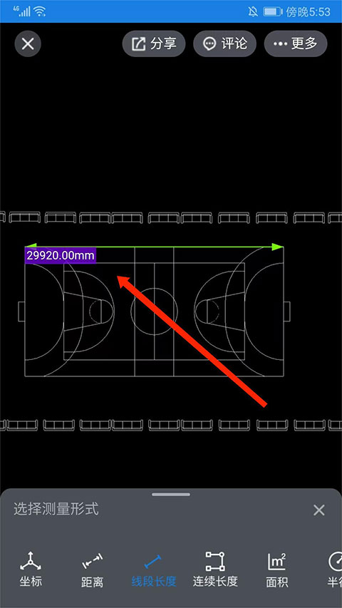 5、支持测量“坐标”、“距离”、“线段长度”、“连续长度”、“面积”、“半径”等数据,这里以“线段长度”为例,
