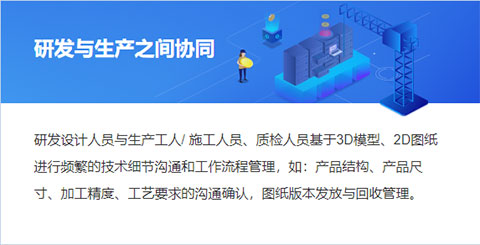 研发设计人员与生产工人/ 施工人员、质检人员基于3D模型、2D图纸进行频繁的技术细节沟通和工作流程管理,如:产品结构、产品尺寸、加工精度、工艺要求的沟通确认,图纸版本发放与回收管理。