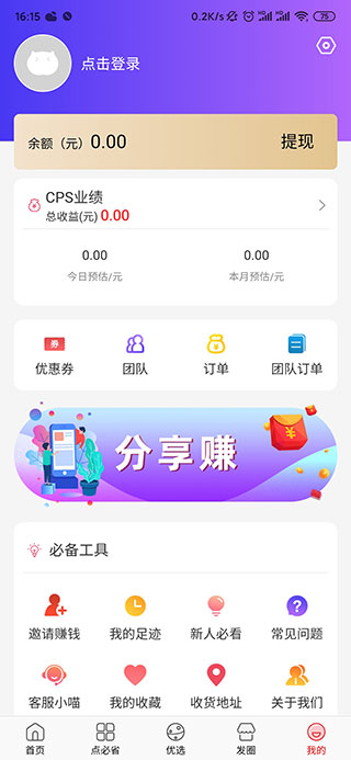 1、在本站下载安装,并且运行软件,就能看到首页、点必看、优选、发圈、我的五个板块,首先点击我的这里有一个分享赚,只需要用户将商品分享出去,有人购买你就能得到佣金: