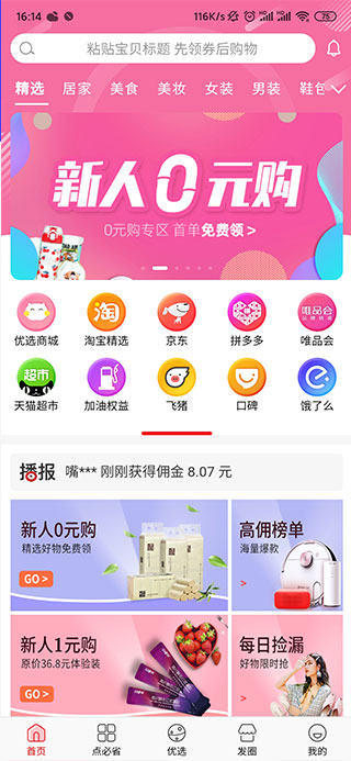 3、在首页中有着大量的活动和平台,列如新人o元购、高佣榜单、新人一元购等等活动,以及淘宝精选、拼多多、京东、唯品会、天猫等各种大型平台: