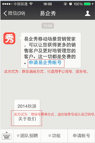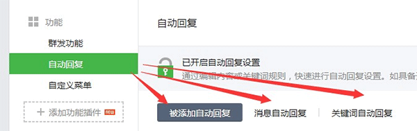 如果你熟悉微信官方平台操作,你还可以使用自动回复的功能来推送场景:添加新粉丝时自动回复推送场景、消息自动回复场景、按关键词自动回复场景。这三个方式,订阅号、服务号均可。