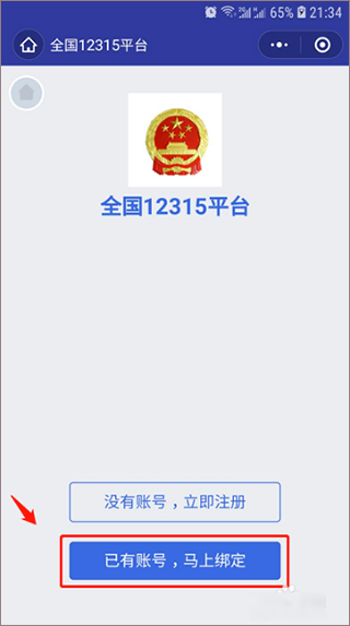 2、输入自己的全国12315平台账号,点击“立即绑定”;